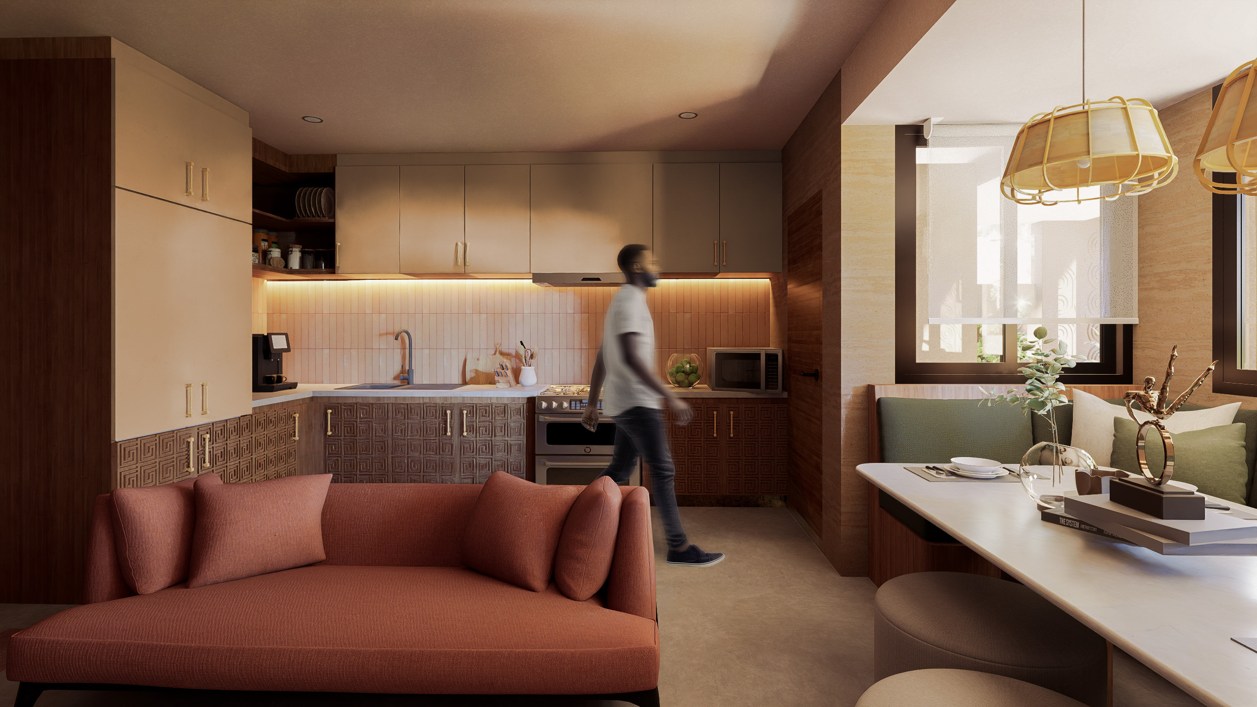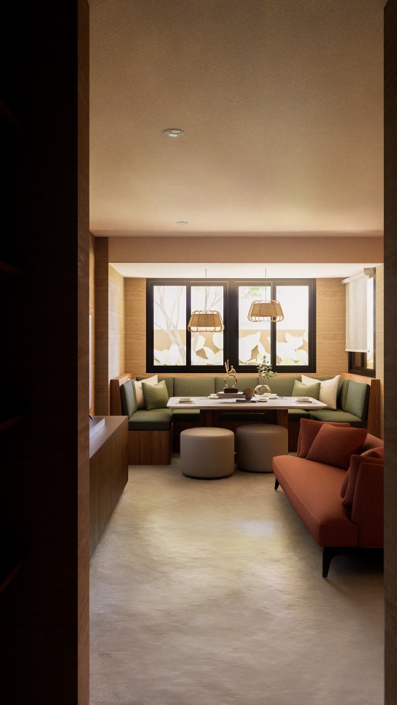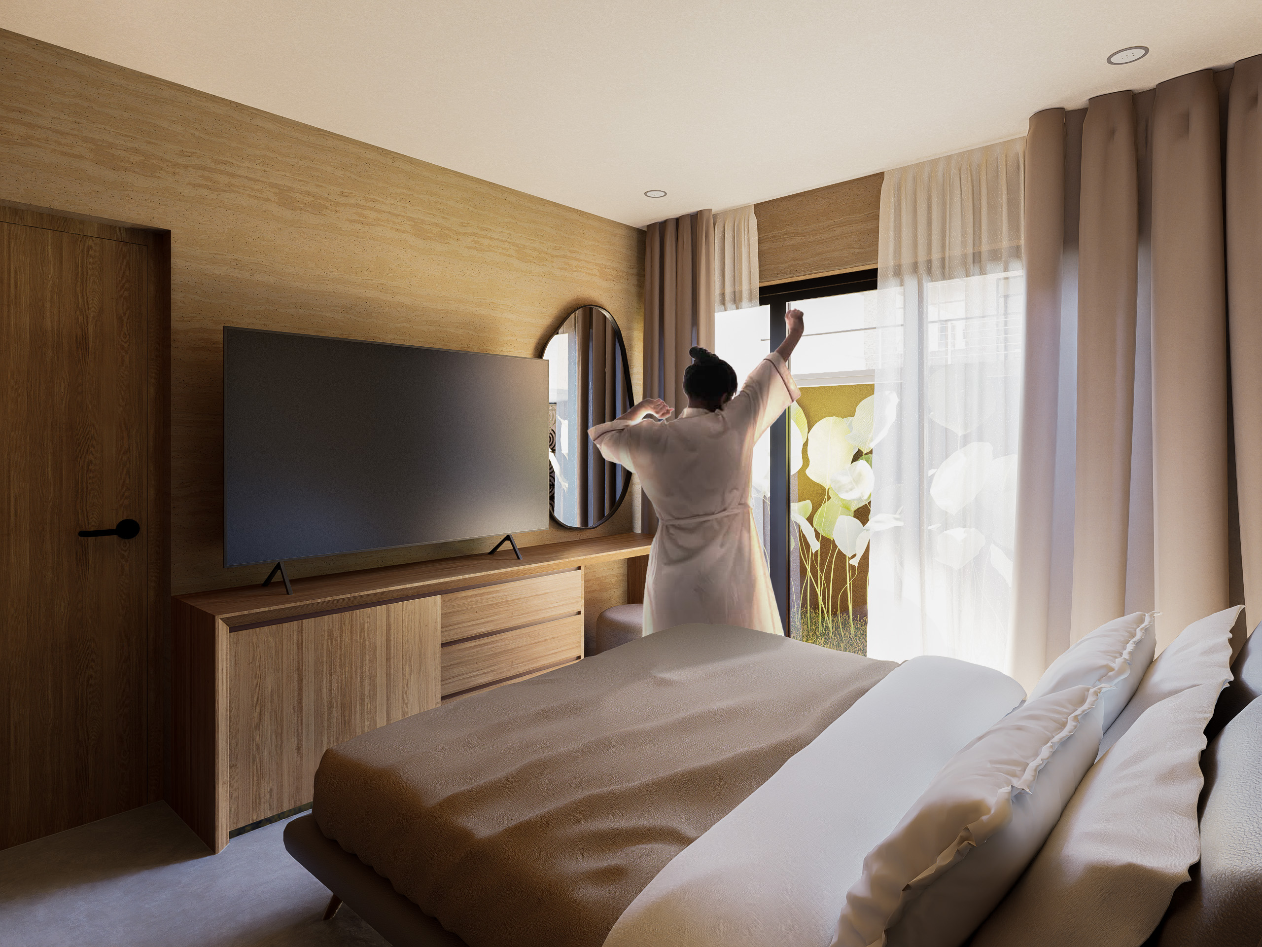 The building accommodates three compact one-bedroom units. One unit faces the eastern garden, while the other two overlook the western reflecting pool. Each unit includes a kitchen, living area, and dining nook—designed for efficient yet comfortable daily living. Both the bedroom and bathroom of each unit open toward a private garden view, oriented away from communal zones to maintain privacy and a close connection with nature.