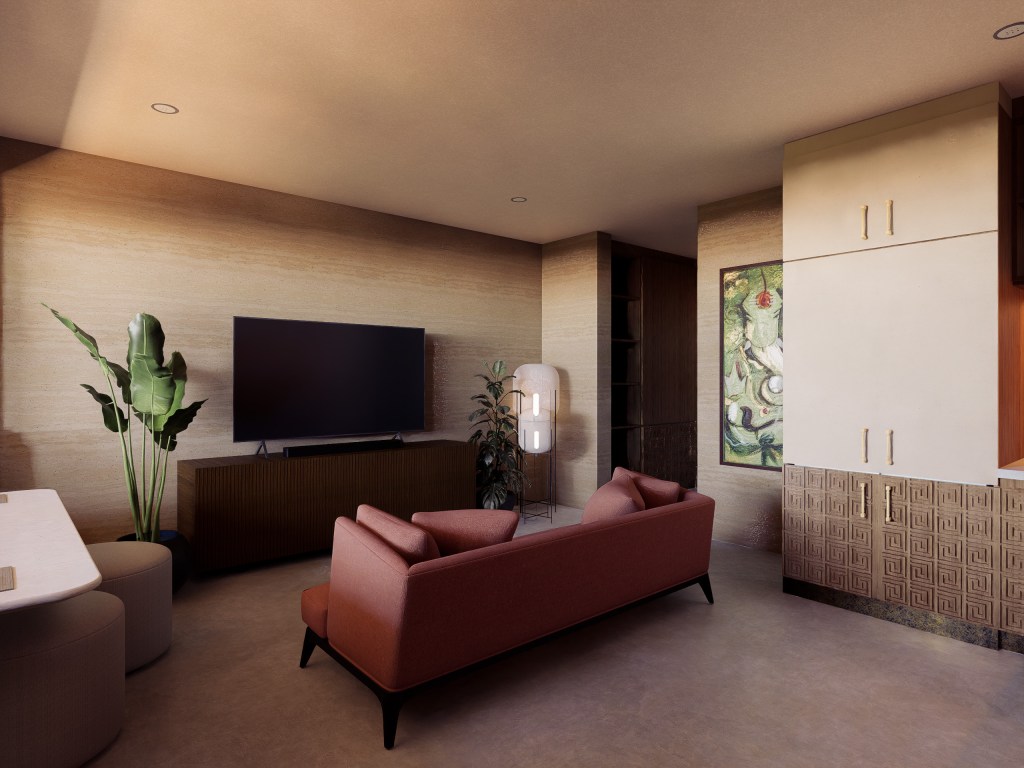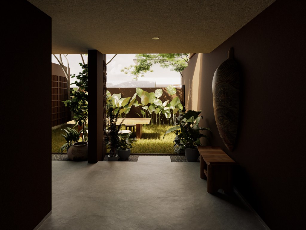 On the western side, a swimming pool runs along the hallway, introducing a calm and cooling atmosphere. Above it, a floating staircase extends across the space, serving as a striking visual centerpiece. The stair’s light structural frame casts soft reflections onto the water below, while the shimmering surface animates the underside of the steps with shifting patterns of light. As the afternoon sun reaches this side, the interaction between the pool and the staircase creates a dynamic play of light and shadow, enriching the space with a tranquil yet expressive character.
