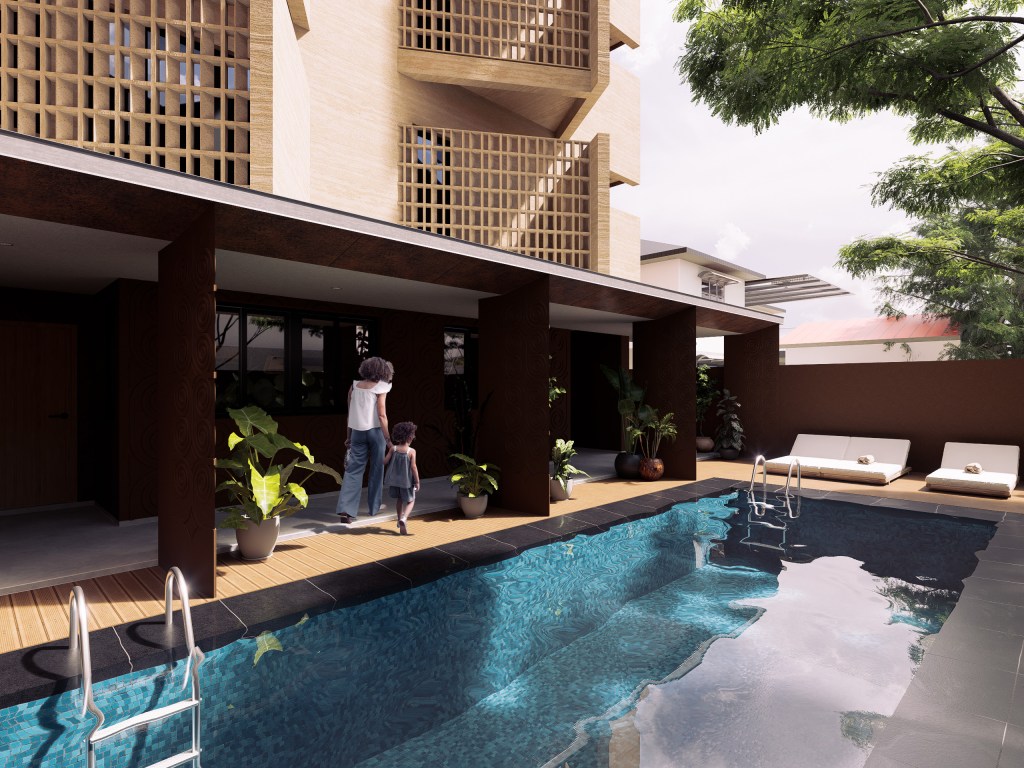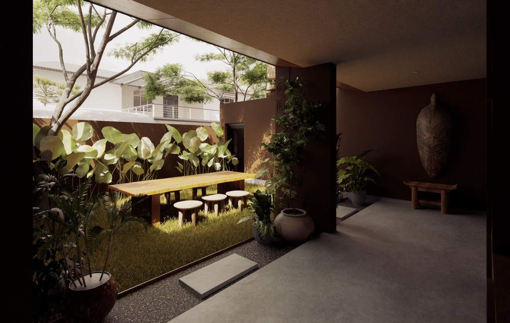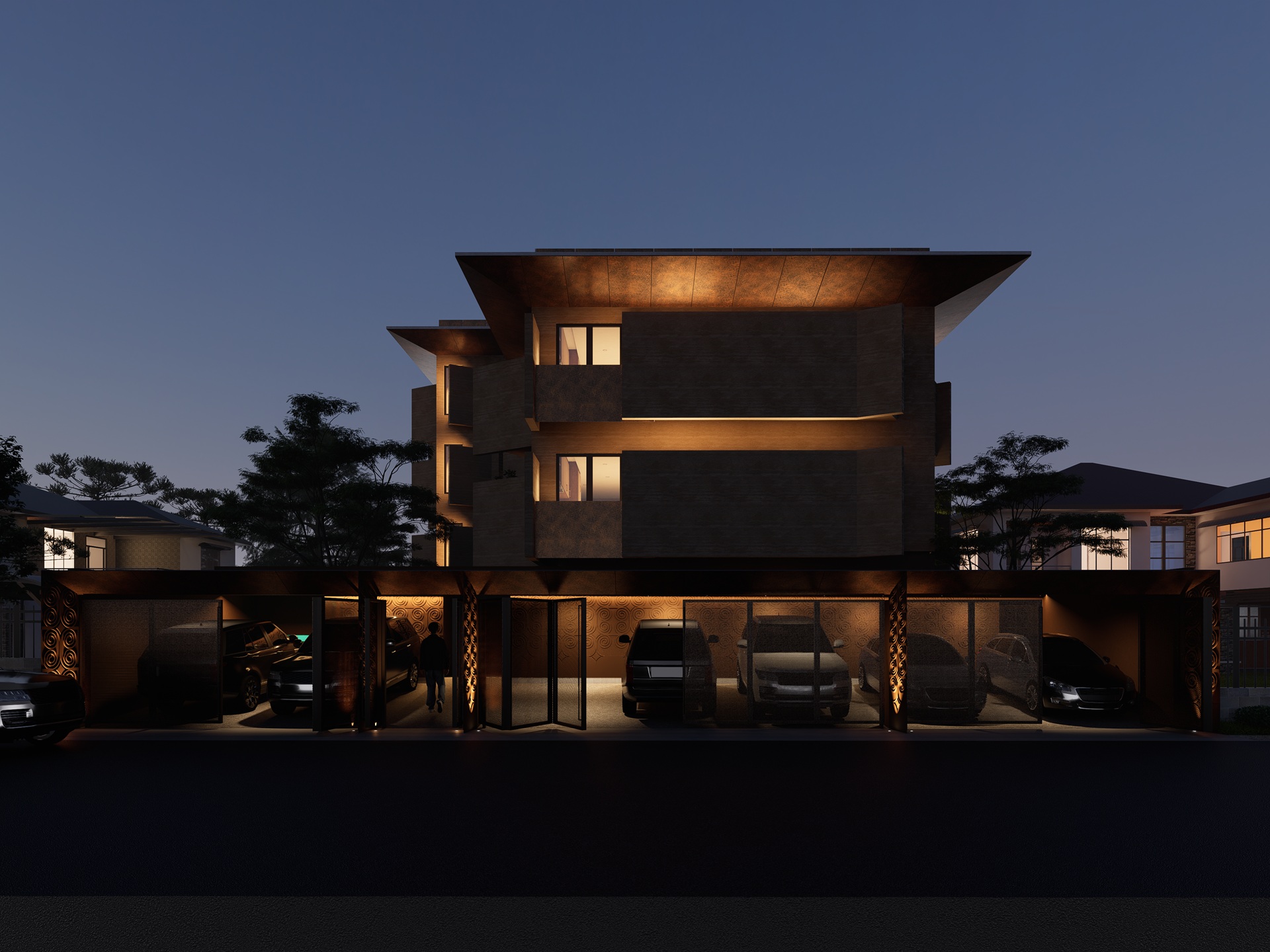 Service and utility spaces are positioned at the front of the building, separated from the main living areas to ensure privacy and provide convenient access for maintenance. The security and administration offices are located behind the car park, maintaining functional proximity while remaining discreet. The generator, electrical room, pump room, and tool room are housed within a separate building mass. The generator is accessible through the garage, while the remaining service rooms face the garden and are visually concealed with breeze blocks, allowing ventilation while maintaining aesthetic harmony.