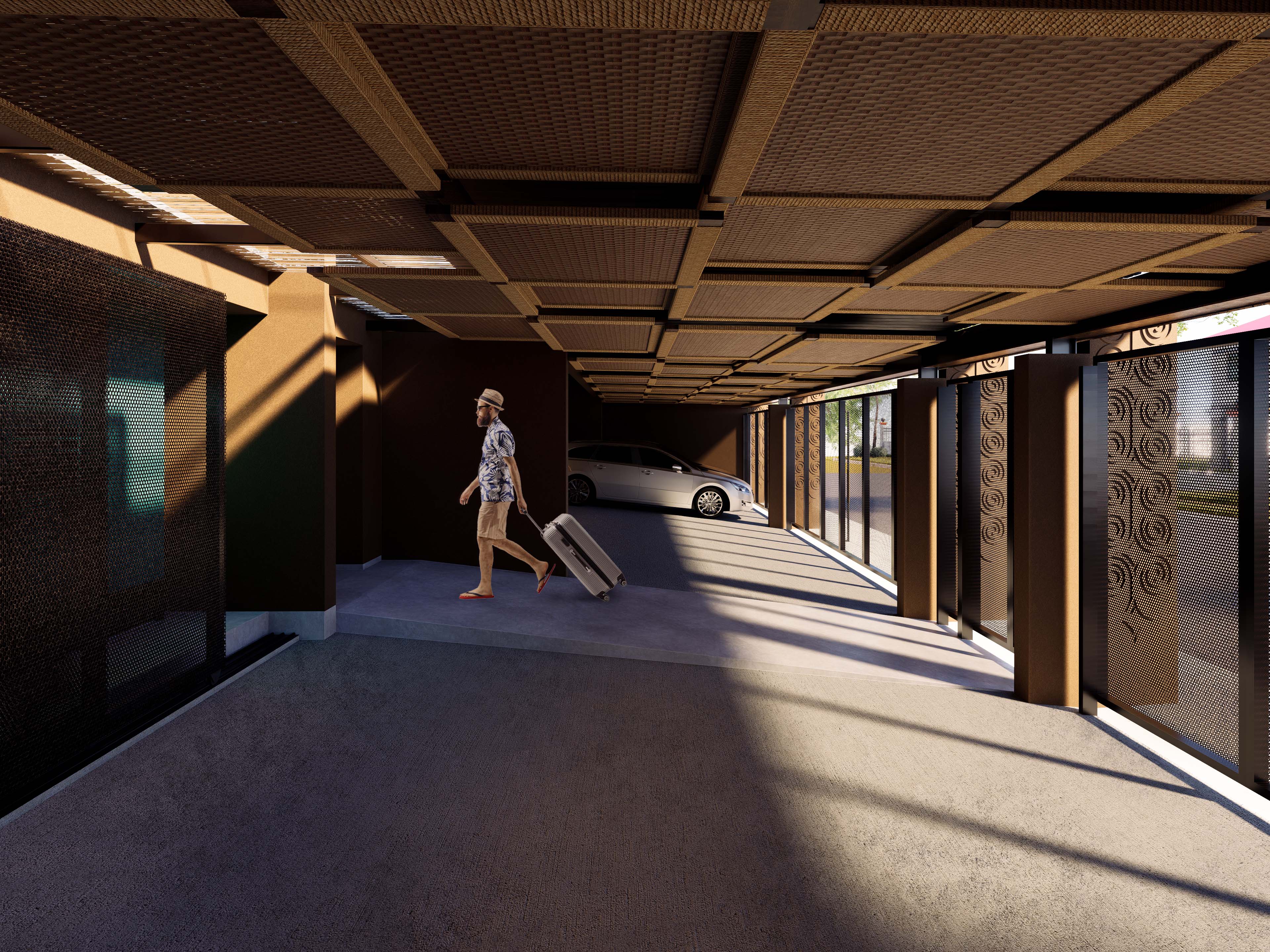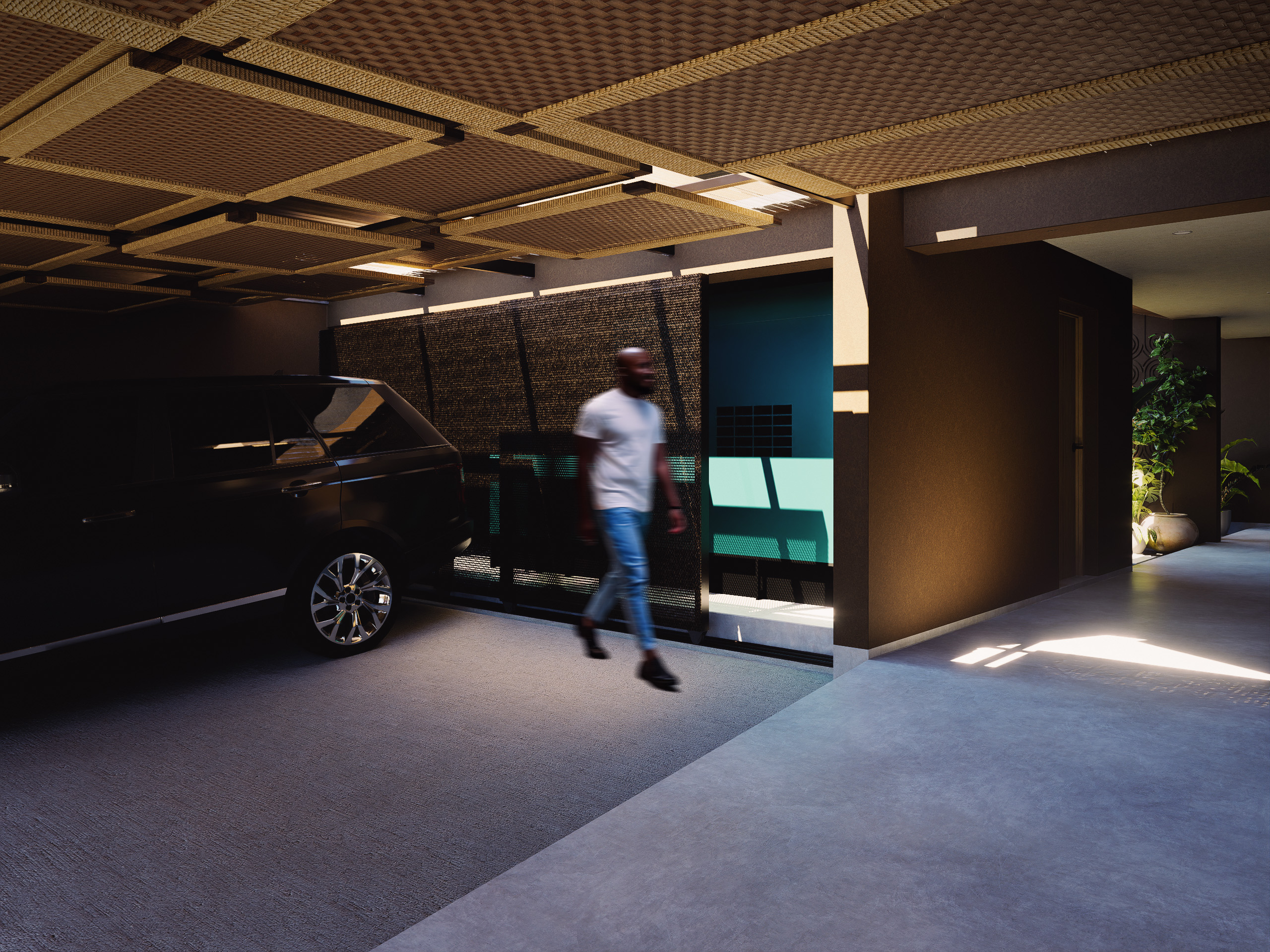 The car park spans across the front of the building, providing space for seven vehicles. It is fully enclosed with perforated fencing, ensuring both ventilation and security. The walls and columns are adorned with Adinkra symbols, celebrating Ghanaian cultural identity, while the canopy roof features woven ceiling panels that help reduce heat and add a tactile layer of craftsmanship. The building’s entrance adopts the same design language as the fence, creating a coherent and unified appearance. From the entrance, a hallway leads toward a central garden, which connects directly to the main staircase positioned at the heart of the building.