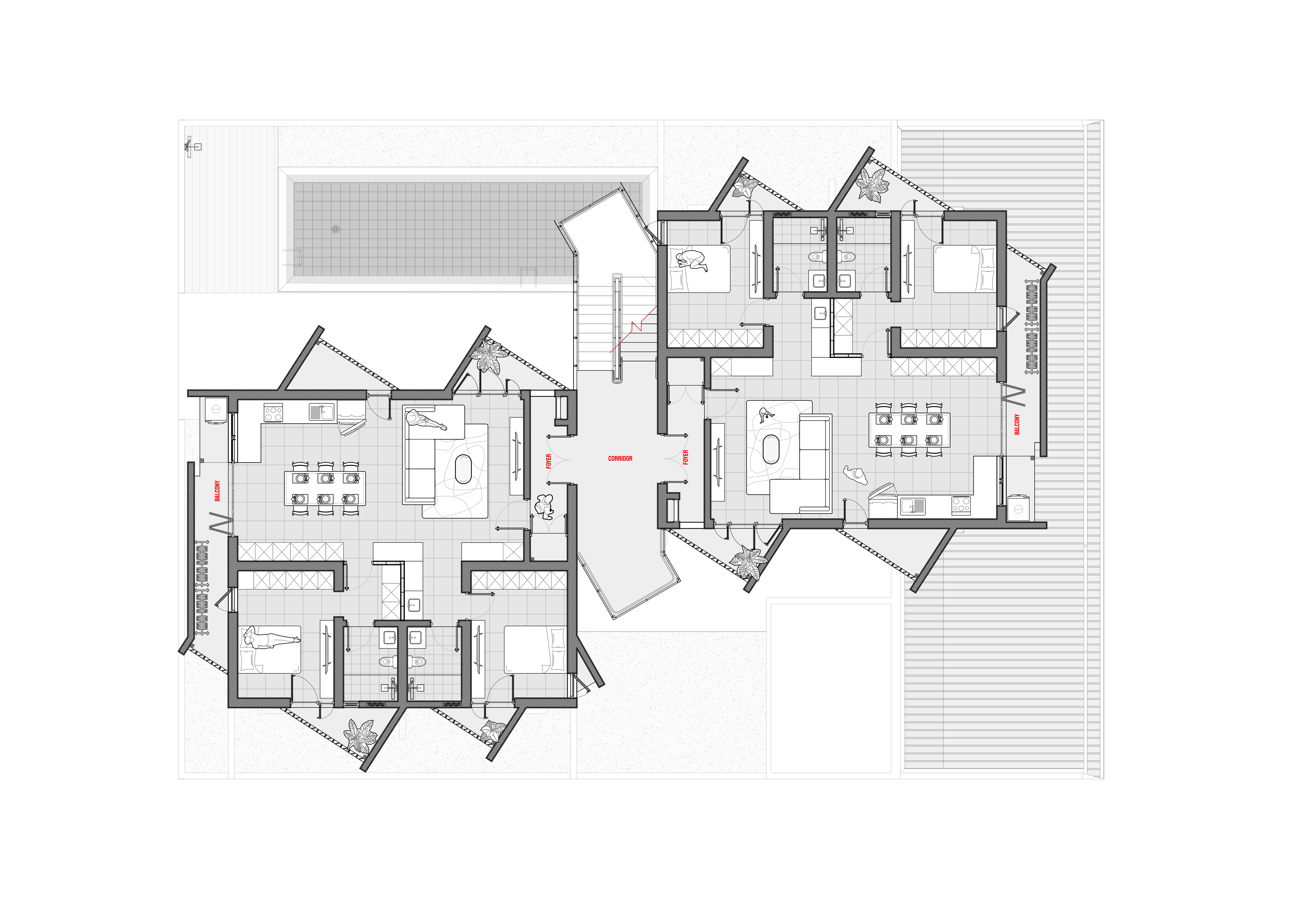 The upper floors accommodate five larger two-bedroom units—two on the second floor, two on the third, and one on the fourth floor, which also enjoys direct access to the rooftop. Each unit features a living area, dining space, kitchen, and a service balcony for functional needs. Additionally, four balconies are integrated into the façade design, acting as filters for sunlight and views while enhancing privacy and security. This configuration ensures that every unit maintains a comfortable microclimate and a layered visual relationship between interior and exterior spaces.