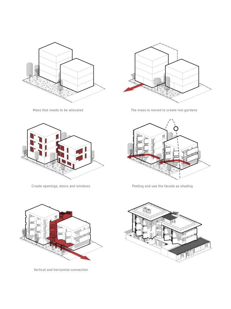 The tropical climate of Ghana encourages us to design with shade as a central element. We explored the interplay between openings and shading, between shadow and light. While the floor plan remains relatively simple, the spatial experience gains depth and richness through the act of “peeling” the building’s walls to form shaded areas. These shaded recesses add both environmental performance and visual complexity to the façade. The building follows a typical floor plan configuration, organized into two main masses.