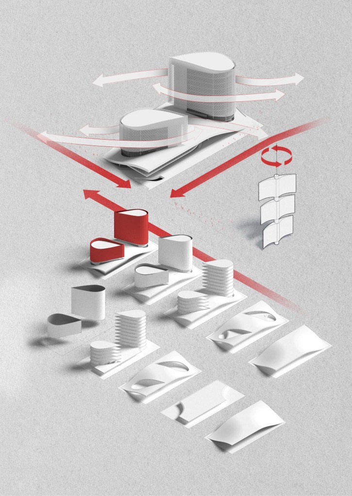 Although a rigorous fluid dynamic simulation has not yet been conducted to assess the building’s performance, the design serves as a visual representation of its potential—demonstrating the possibilities of utilizing wind as a driving force in shaping the building.