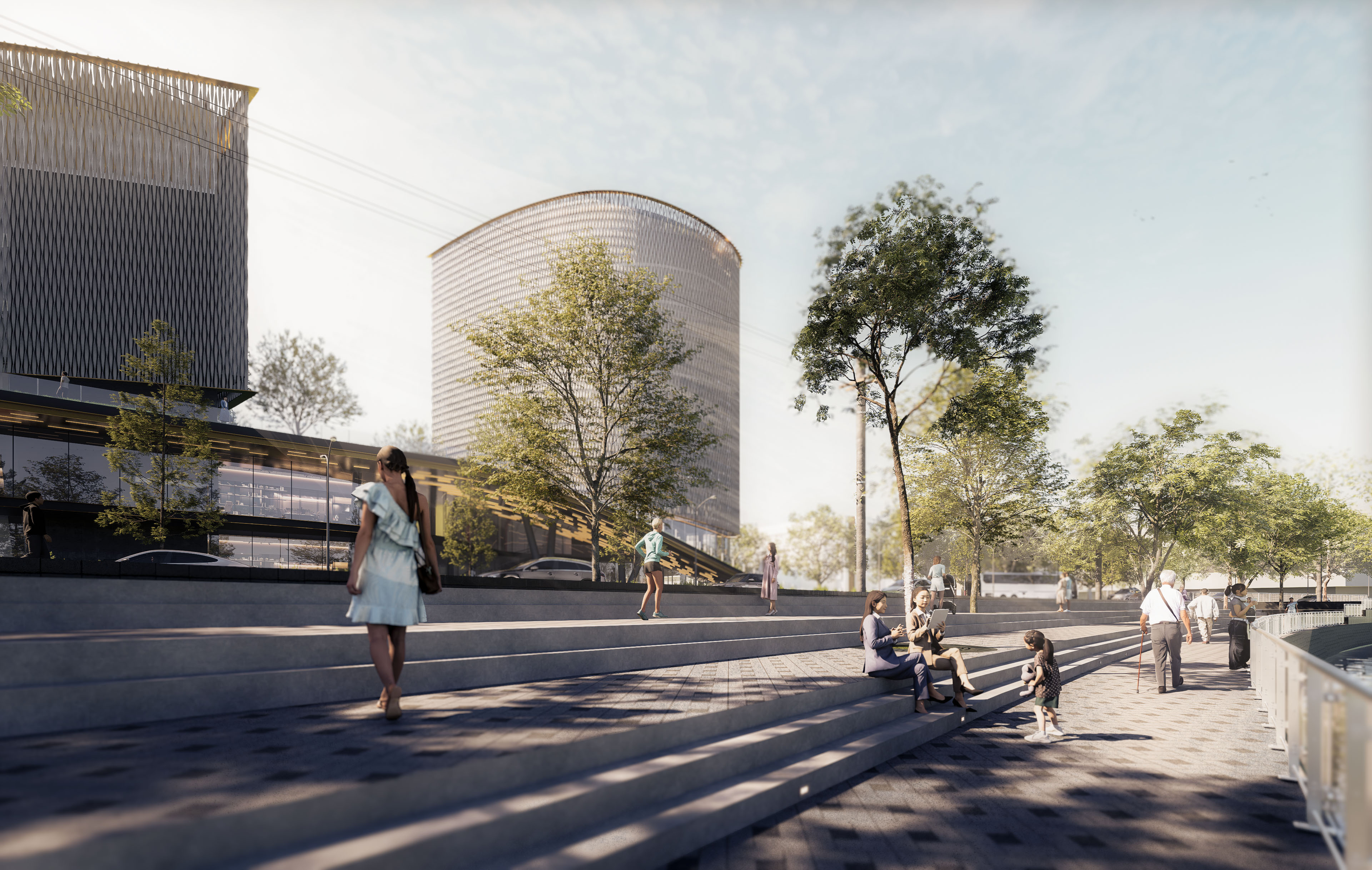 The podium terrace functions as a stairway, seamlessly connecting the lower commercial area with the upper office space. It also serves as an elevated terrace, offering an enjoyable view—especially towards the south, where the river flows. This terrace is bathed in sunlight during sunrise from the east and sunset from the west, creating a welcoming atmosphere for workers in the morning and a peaceful retreat during the evening commute back home.