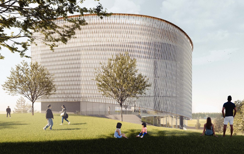 The office buildings are divided into two masses: the west and east buildings. Each can accommodate offices of different sizes. The buildings are enveloped by small, tall turbines, designed in response to the plentiful wind in the area. While large turbines would be neither economical nor effective at the building’s height, smaller turbines—strategically positioned and supported by the building’s form—can harness slower yet abundant winds more efficiently.