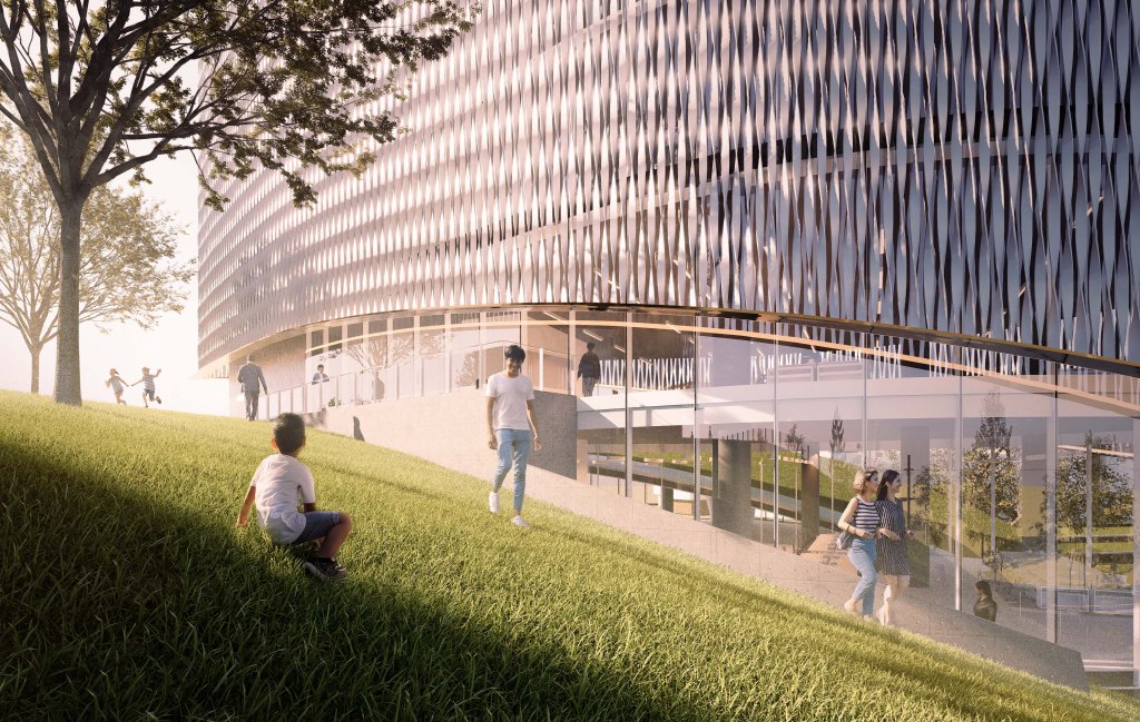 A key feature of the surrounding area is the walkway, designed to make the building most enjoyable for pedestrians. A wide grass terrace on the podium level bridges the two corners of the building, preserving the green space that would otherwise be lost to the building’s footprint. This podium level also serves as a natural divider between the commercial and office functions. Workers can simply walk up the landscaped slope to reach their offices, creating a seamless and pleasant transition between spaces.