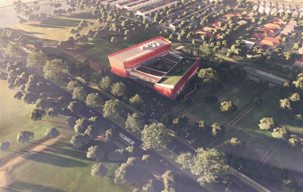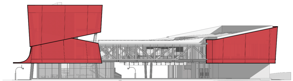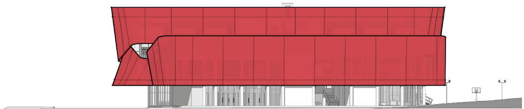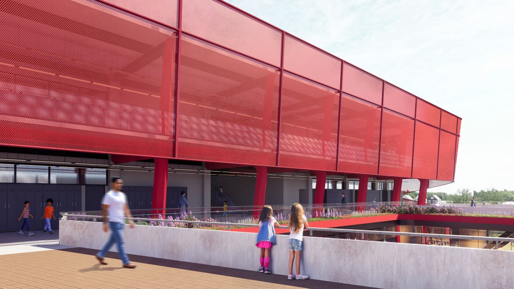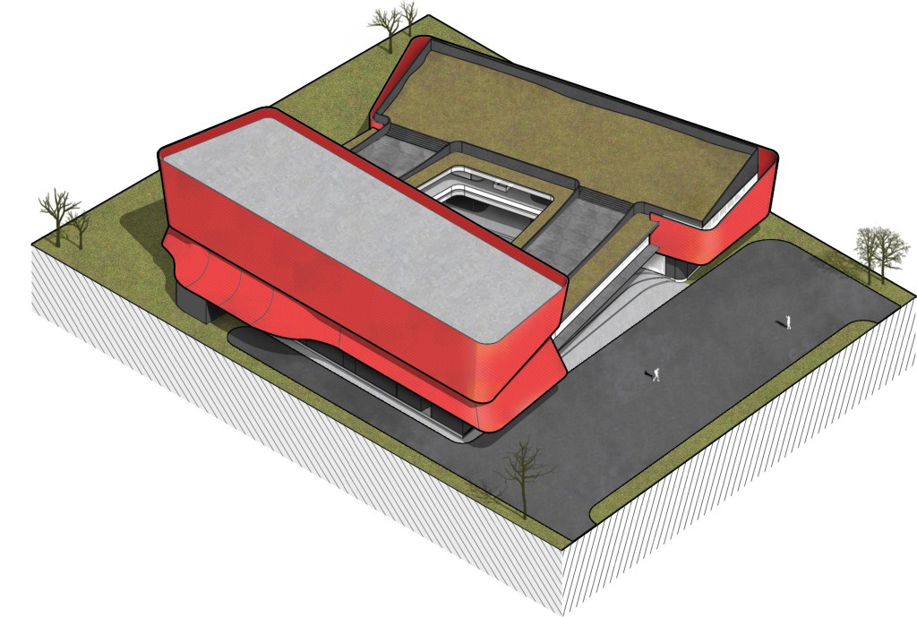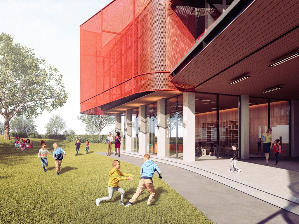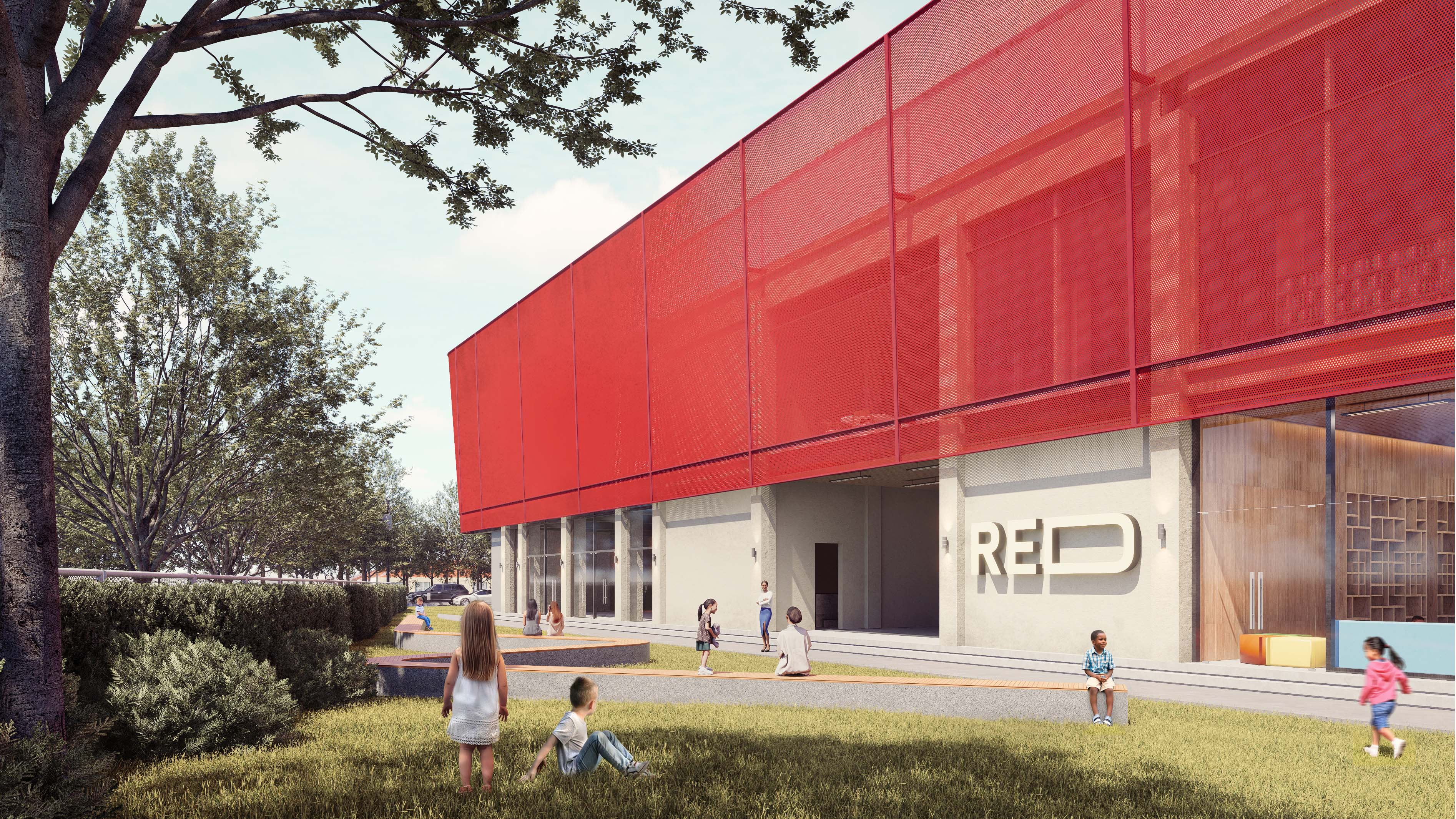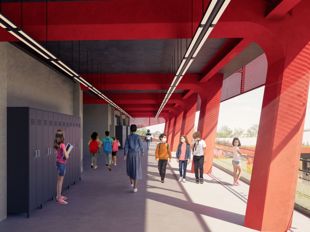 Rather than dominating open spaces, the architecture is designed to enhance them. Glass openings on the ground floor promote transparency and connectivity, while the vibrant red color complements the playful nature of the open spaces.