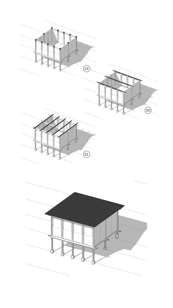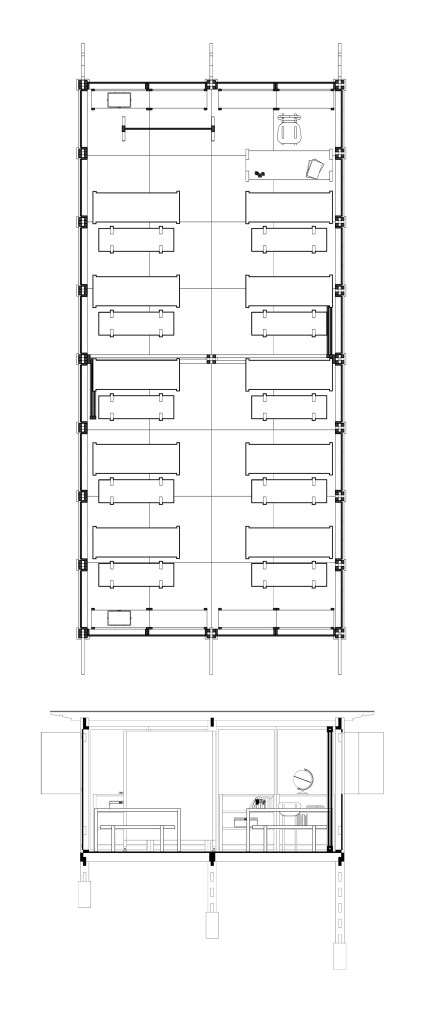 Spaces underneath the classroom could be used as storage or other useful functions such us for water containers collecting rain water, for temporary shelter to sleep in case of emergency, to grow small animals like chicken (depends on the function in the interior above) or to grow vegetables in hydroponic methods.