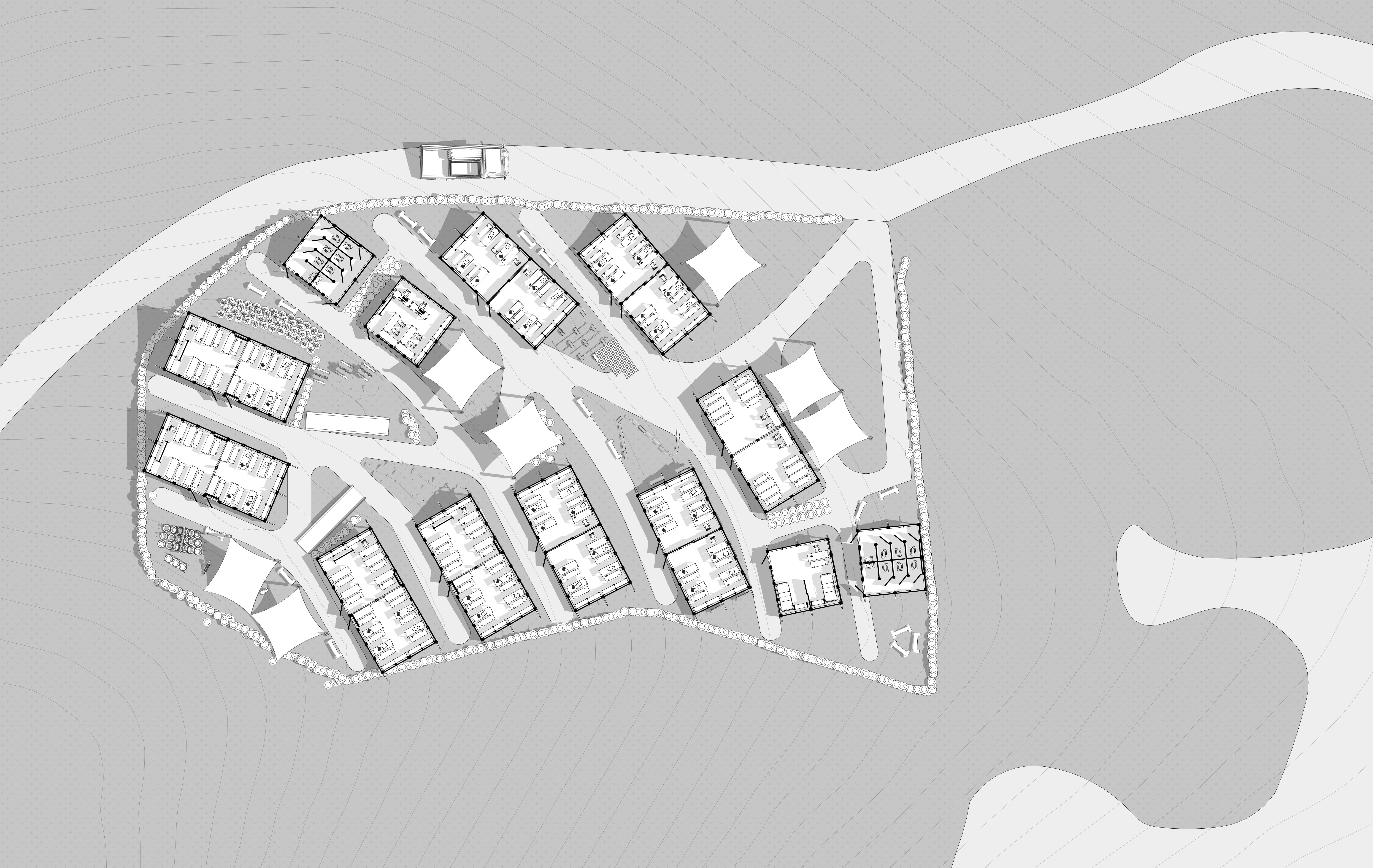 The project site is located in Khan al-Ahmar village, Palestine, on a hillside overlooking the community. One of the main challenges was working with the site’s natural contours, which we embraced by designing a layout that follows the terrain. Although all building masses share a similar form due to their modular construction, the interior spaces are designed to be flexible and adaptable. The school consists of five primary functions: classrooms, a multipurpose hall, a teachers’ room, a medical room, and toilets. Classrooms are spread throughout the site, while the centrally placed teachers’ room allows for effective supervision and quick emergency response. To support both the school and the surrounding community, the multipurpose hall and medical room are positioned at the base of the site, providing easy access for local residents as well as students