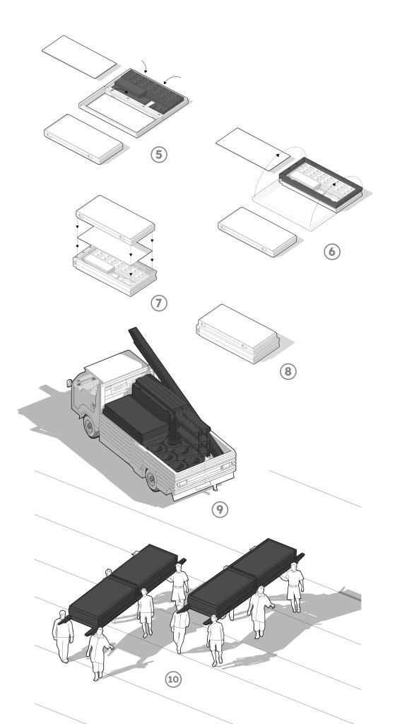The use of foldable furniture ensure the flexibility of the interior spaces. The folded furniture can be stowed inside the class or underneath the class. These furniture is also will be able to be transported inside the folded modules of wall and floor panels.