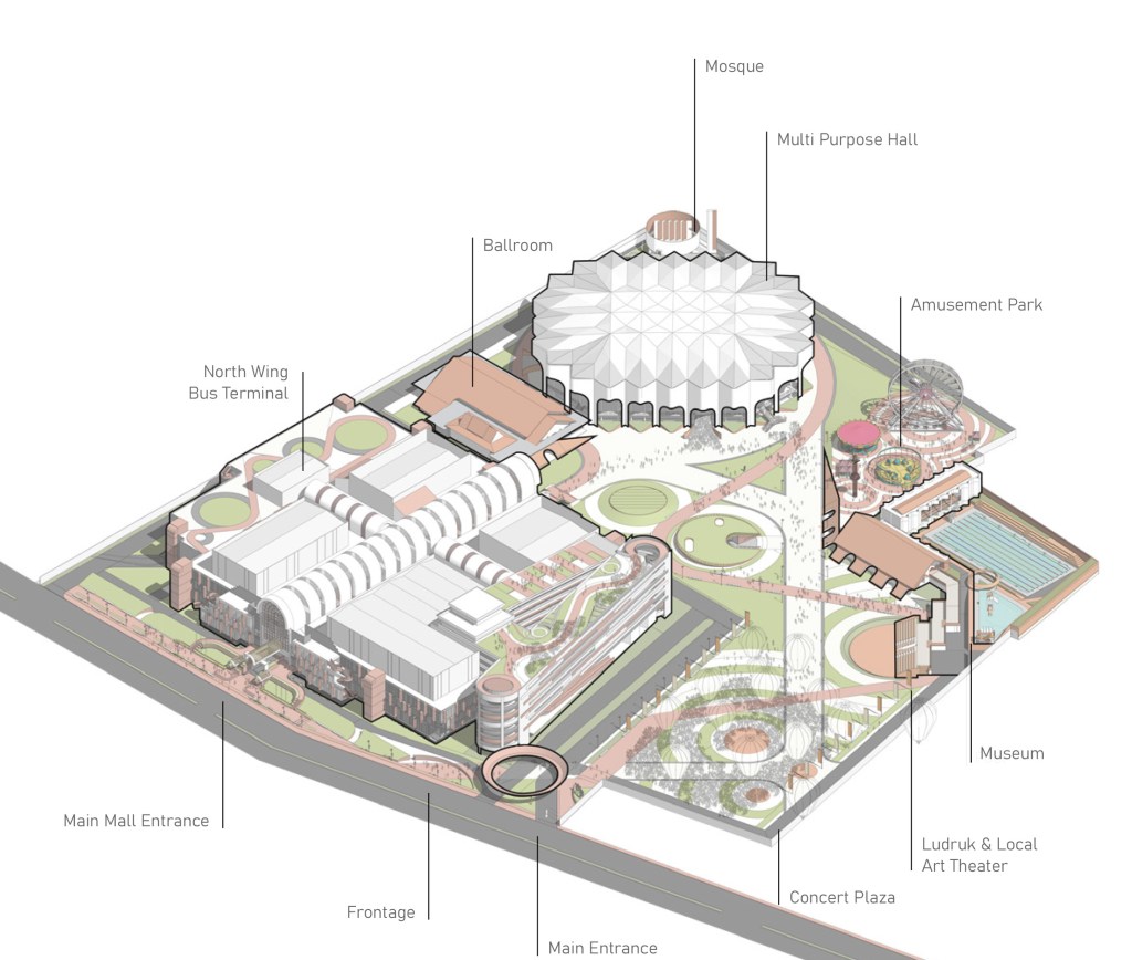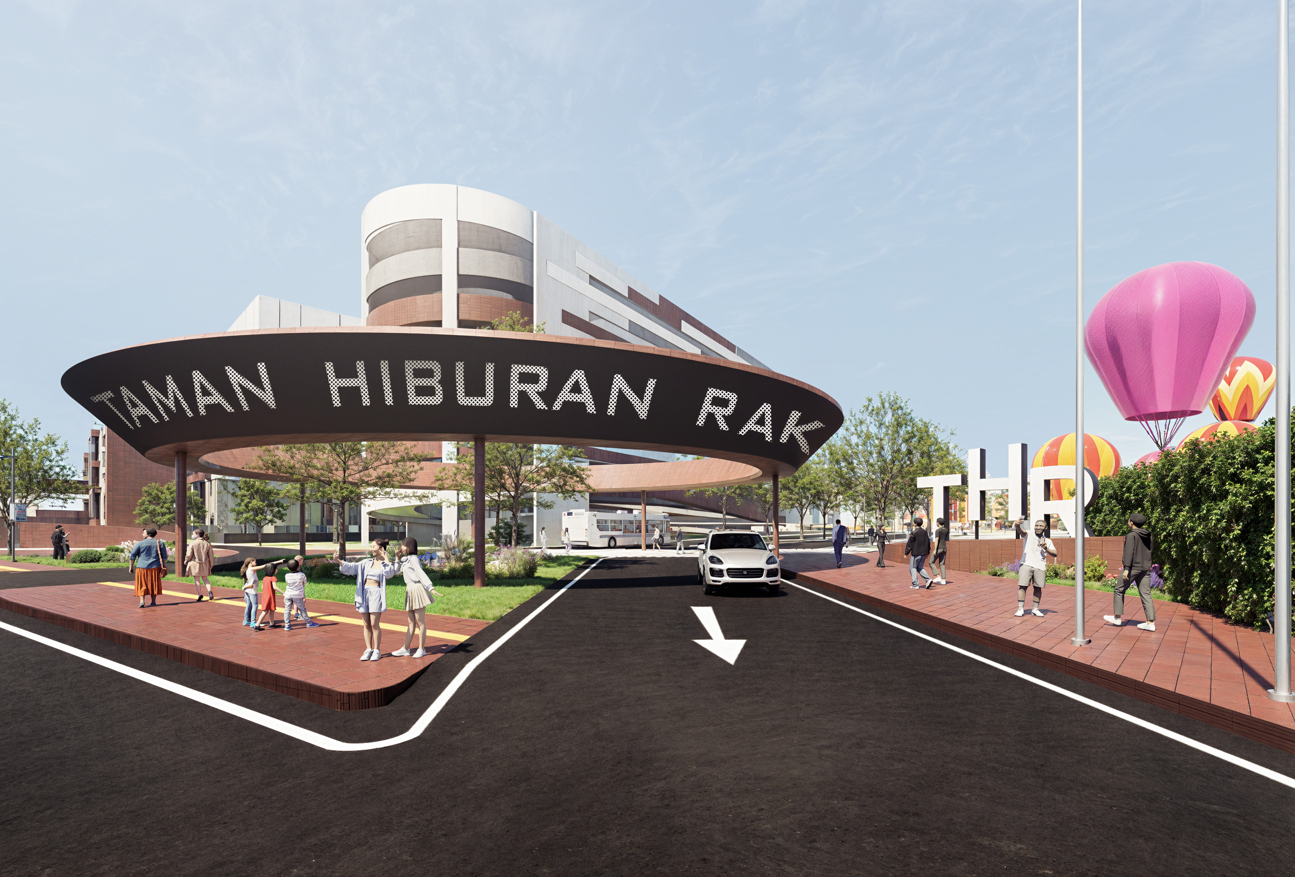We also redesigned the main entrance to be more visually striking. This intervention addresses a key challenge: the entire front façade of the masterplan is blocked by the Hi-Tech Mall building, limiting visual access to the THR (Taman Hiburan Rakyat) behind it. To solve this, we introduced an LED screen entrance gate that can display activities happening inside the area. The screen is elevated and angled downward to ensure high visibility—striking enough to capture attention, yet clear and legible for cars and buses passing by.